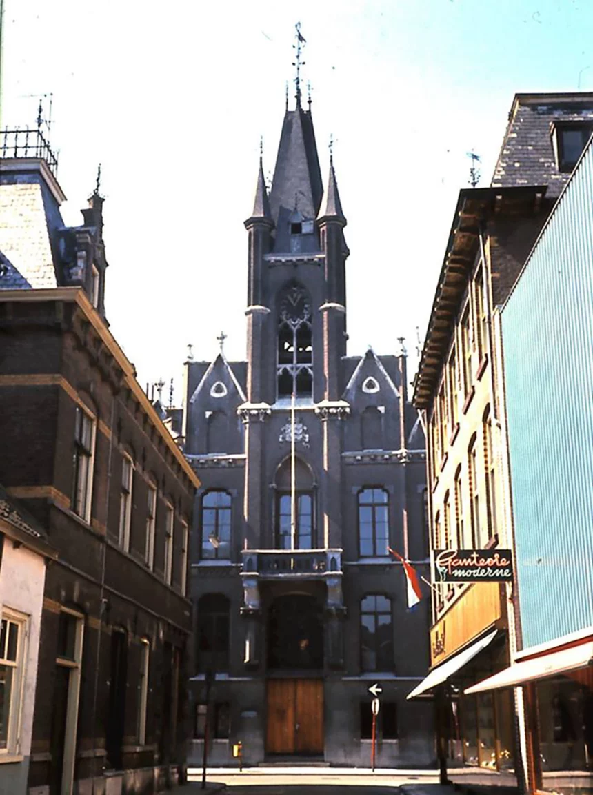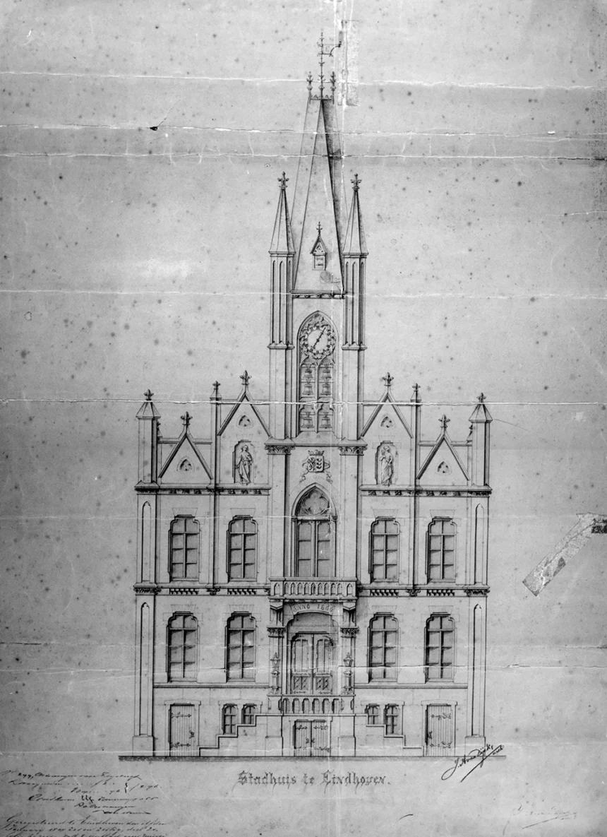 In architectonische zin was het stadhuis uit 1868 niet heel bijzonder, vindt Hüsken. „Het is ontworpen door Johannes van Dijck, de stadsarchitect van Eindhoven – veel steden hadden destijds een architect in loondienst. Eindhoven had voor het ontwerp een prijsvraag uitgeschreven, maar geen van de ontwerpen kreeg de vereiste steun. Daarop combineerde Van Dijck elementen uit de diverse ontwerpen; zo kwam het ontwerp tot stand. Het is ontworpen in neogotische stijl met als kenmerkend element het spitse torentje met schilddak. Maar het was wel een gezichtsbepalend gebouw in het hart van de stad.”